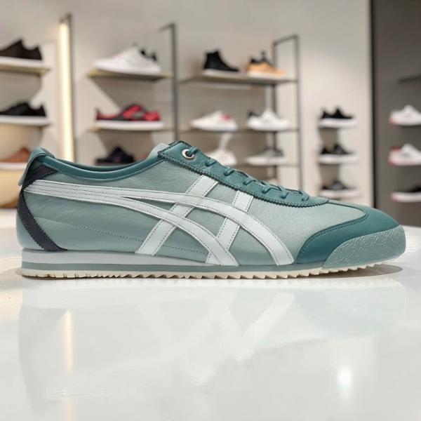 Luxury Refinements: Features thin, waxed laces and a polished finish. It retains the signature "X" reinforced heel stitching and the functional "Tiger" branded heel flap in a tonal mint or ocean haze.